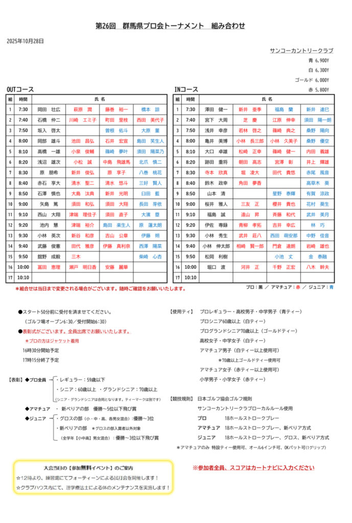 2025年10月18日 / 最終更新日時 : 2025年10月18日 gunmaprogolf お知らせ 第26回群馬県プロ会トーナメント 組み合わせ 2025年10月28日(火)、サンコーカントリークラブ様にて開催予定の「群馬県プロ会トーナメント」の組み合わせです。 組み合わせは当日まで変更される場合がありますので、随時ご確認をお願い致します。 Follow me!