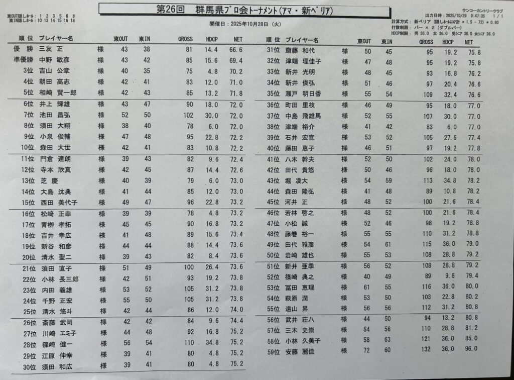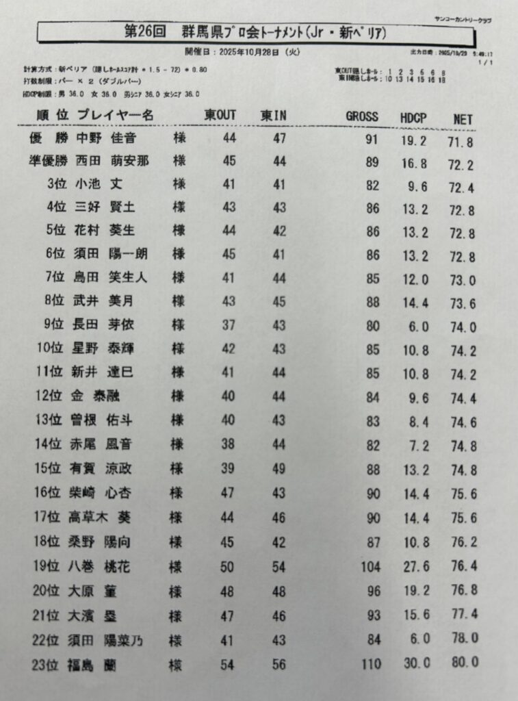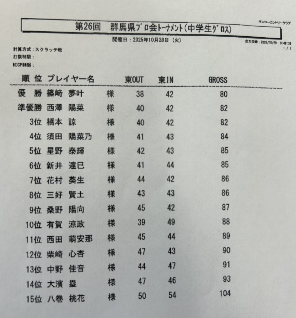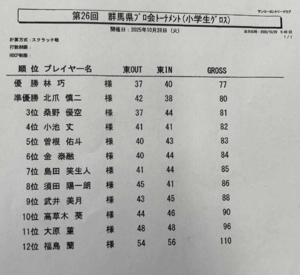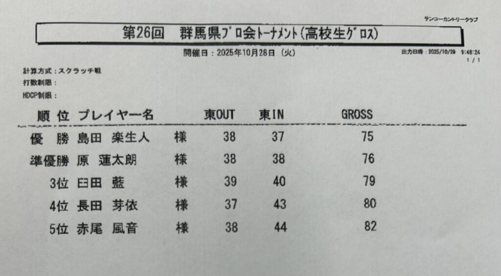2025年11月5日 / 最終更新日時 : 2025年11月5日 gunmaprogolf お知らせ 第26回群馬県トーナメント 成績表 【小学生の部】 【中学生の部】 【高校生の部】 【ジュニア 新ぺリア】 【アマチュア 新ぺリア】 Follow me!